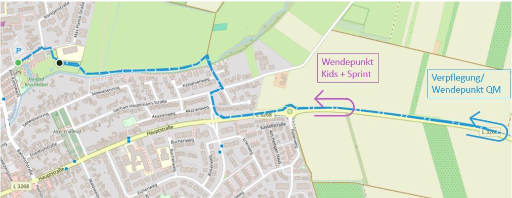 - T-Wende kurz nach dem Kreisel (Sprintdistanz) bzw. kurz vor der Landwehr (Quarterman-Distanz)